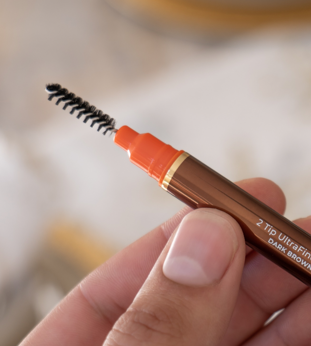 Take the brush on the opposite end and gently blend the product into the areas you applied it. This will help soften the lines and create a more natural, even look. It’s optional, but if you want a smoother finish, this step makes all the difference.